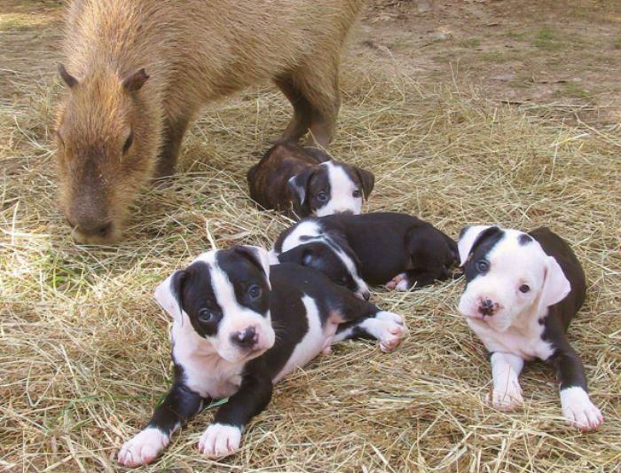 Capivaras não parecem ser animais muito fofos, no entanto, elas tem um instinto materno muito forte. No ano de 2010, Cheesecake, uma capivara, morava com seu dono no Arkansas. Foi aí que ela começou a atuar como "mãe substituta" de alguns cães que nasceram por lá e perderam a mãe.