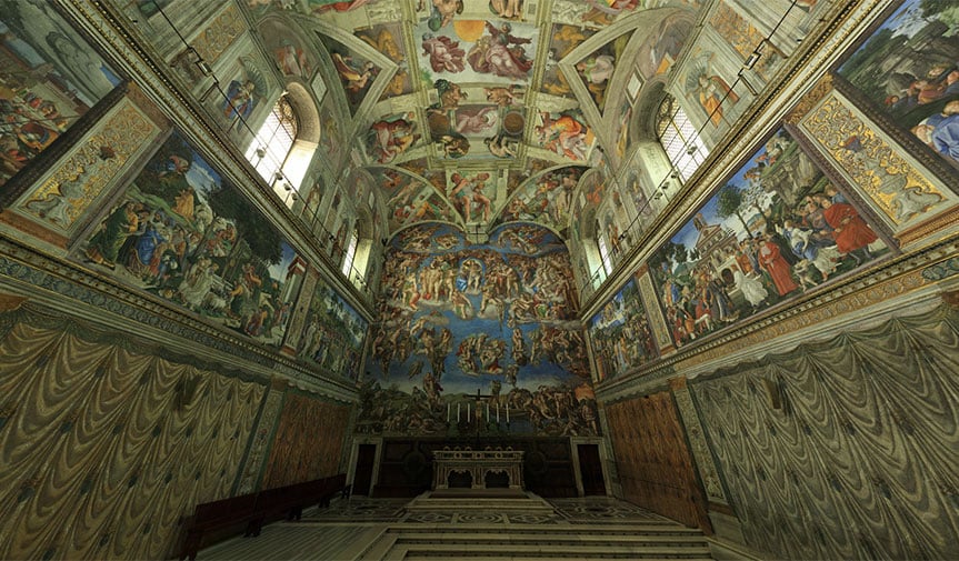 A Capela Sistina é a casa da arte mais duradoura de todo o Renascimento. A pintura e decoração do templo foram encomendadas pelo próprio Papa Júlio II, ao grande mestre artista Michelangelo. Ao contrário do imaginário popular de que o lugar é enorme, vale lembrar que ela é apenas uma capela. Não é catedral, nem mesmo uma igreja. Suas dimensões são de apenas 40 x 13 x 21 metros. Acredita-se que seu tamanho tenha sido uma inspiração vinda do Templo de Salomão, supostamente construído em 70 depois de Cristo.